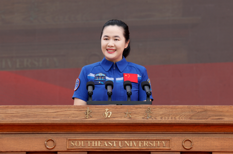 在师生们的热切期盼中,东南大学校友王浩泽从学术之门中走出,现场爆发出热烈的掌声。王浩泽表达了阔别多年回到母校的激动心情,向母校师生的亲切关怀和惦念表示感谢。她分享了勇挑极限、探索太空的主要情况,表示母校“止于至善”的校训始终激励着自己,在不懈奋斗中她做成了很多曾经以为做不到的事。她鼓励新生说,当你发现你的努力能够为国家的发展增砖添瓦时,你会觉得特别幸福。她希望同学们在不远的将来都能体会到这种幸福,都能大声地说出“我的人生很有意义!”坚定的话语回荡在草坪上,感染了在场的每一个人,全场再次响起热烈的掌声。
