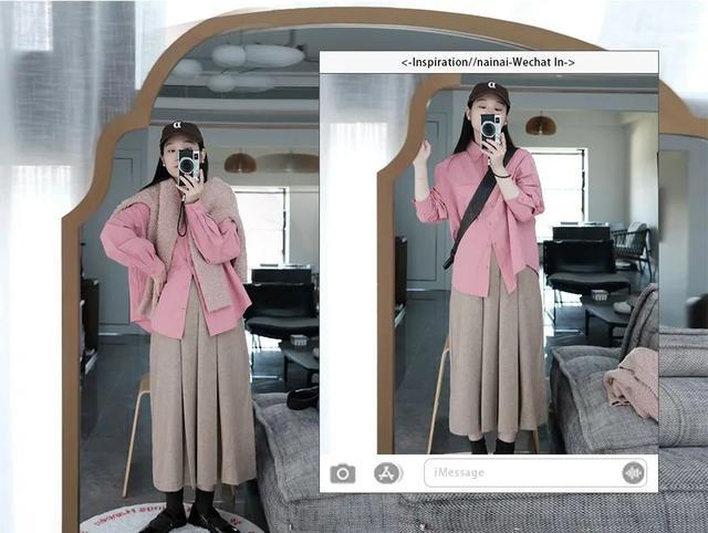 哇,这件干枯玫瑰色衬衫,令人惊羡的美!下面搭配了浅咖色百褶裙,用学院味中和一点女人味,更加有深度有气质~
