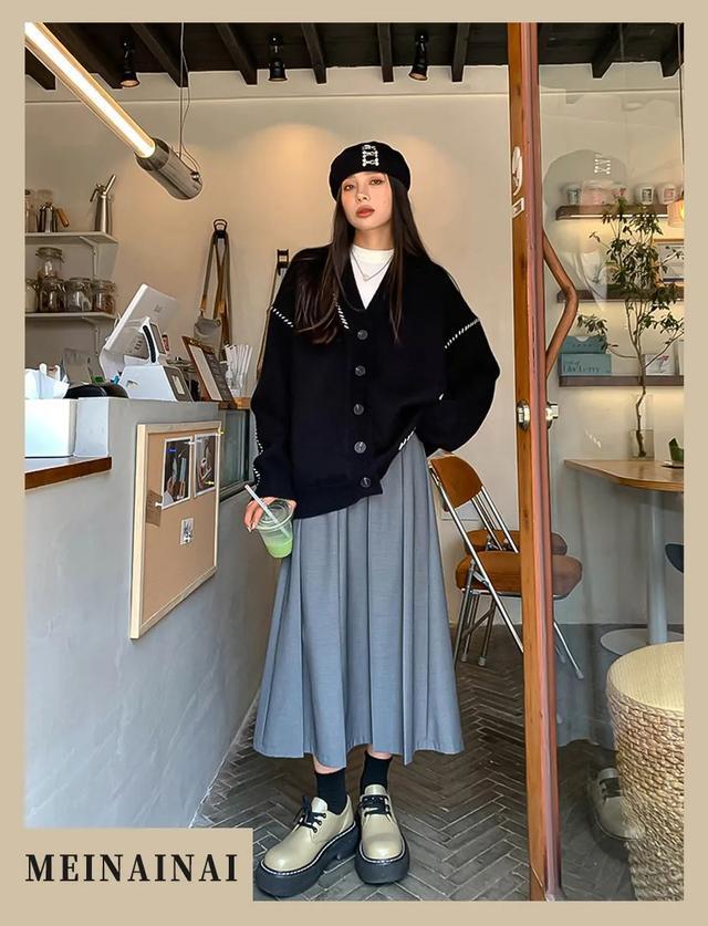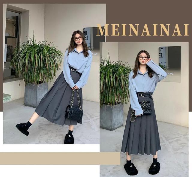 百褶短裙还可以配上长筒袜~整体黑白灰三种颜色,有设计感的同时又不繁琐,真的爱死秋天啦!