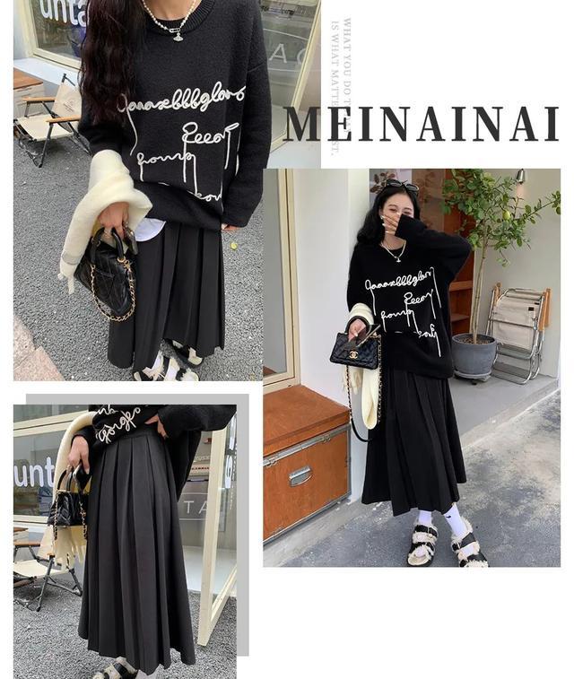 怎么能少得了套头毛衣的呢!里头再叠加一件白色T恤,搭配百褶长裙,层次感有!