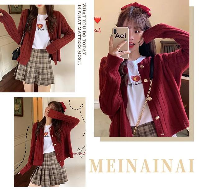秋冬的显白穿搭怎么能够没有一件红色的开衫毛衣呢,配上有点蓝色条纹点缀的百褶裙,顿时有一种年过节的感jio了~